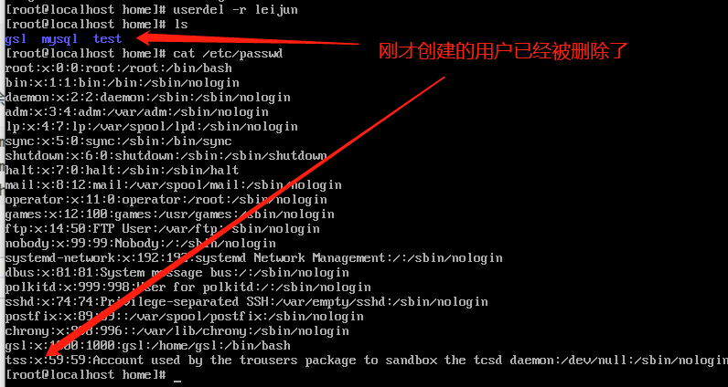 userdel -r leijun: 删除用户,并且删除【home】文件夹下相应的用户目录