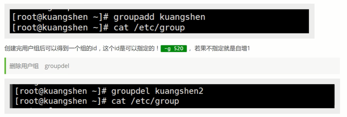 groupadd -g 3333 test2 : 创建用户组,并指定id为 3333。如果不指定则会用默认的