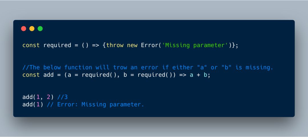 在下图示例中,我们将 required() 函数的 a 和 b 参数设置默认值。这意味着如果 a 或 b 未被传递,那么 required() 函数将在调用时得到一个错误。