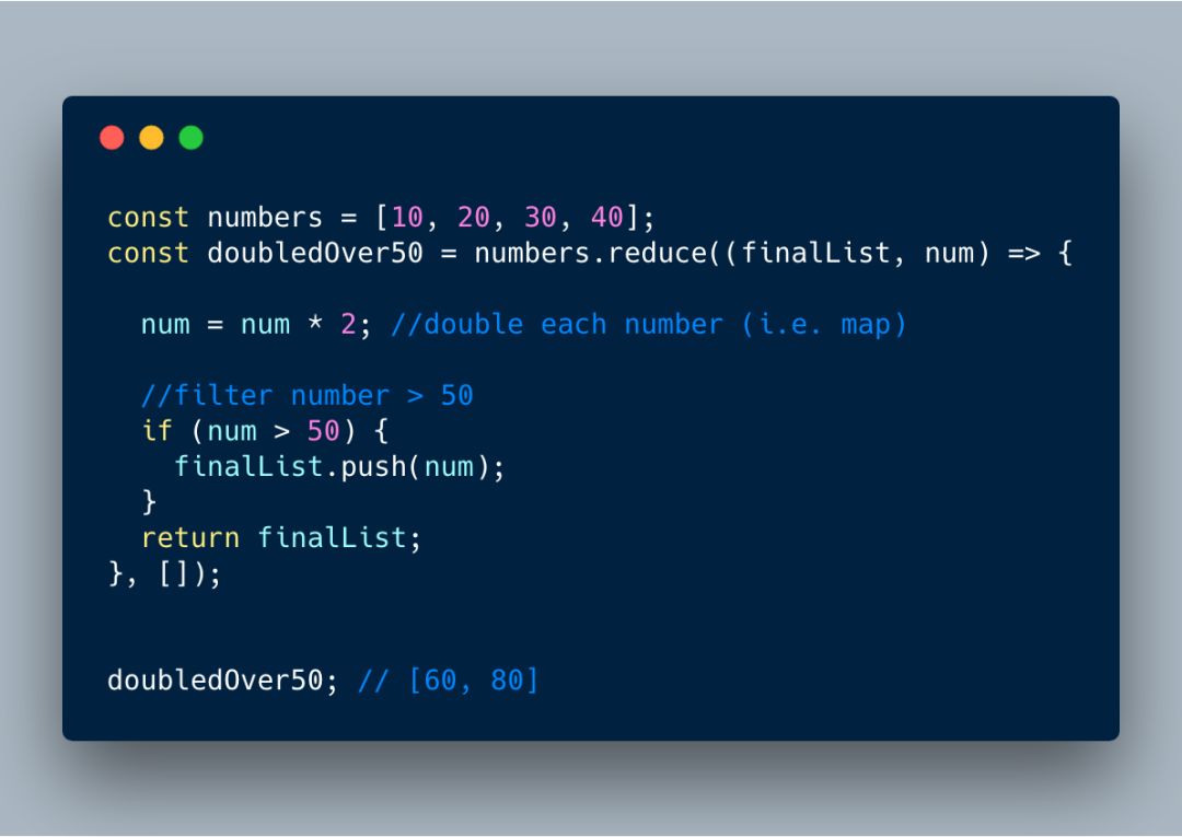 下面这个示例中,我们把数组中的每项的值翻倍,然后选出所有大于 50 的值。注意,我们是如何使用强大的 reduce 方法来同时进行翻倍(映射)和过滤的?那是非常有效的办法。