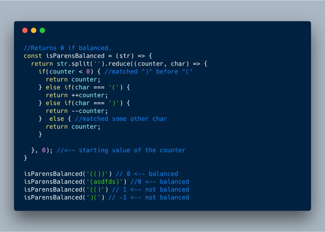 我们可以像下面这样用 reduce 轻松解决。我们需要一个叫 counter 的变量用作计数器,其初始值为 0。如果我们遇到 ( 就加 1,遇到 ( 就减 1。如果它们完全匹配,我们最后会得到一个 0 值。