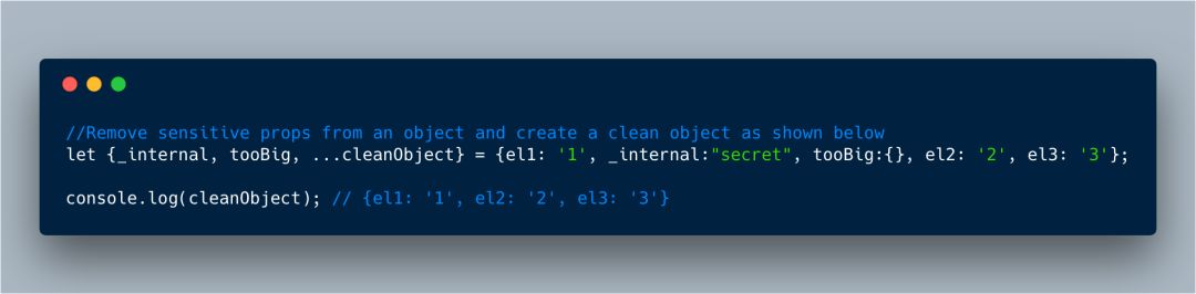 很多时候,当你想要删除不想要的属性——可能会因为他们包含敏感信息或者就是因为他们太大了。在 *rest* 参数中,除了迭代整个对象来删除他们这个方法之外,我们还可以简单地提取这些属性变量,以保持有用的。
