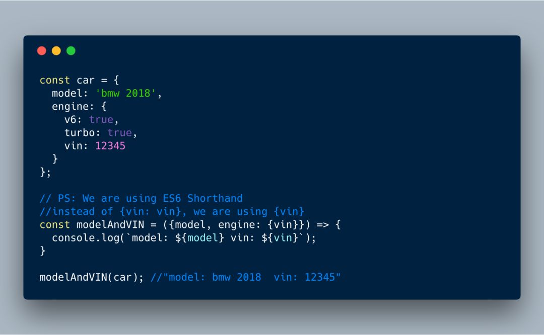 下面的示例中的 engine 属性是 car 对象中的一个嵌入对象。如果说我们需要 engine 的 vin 属性的话,可以像下面这样使用解构轻松实现。