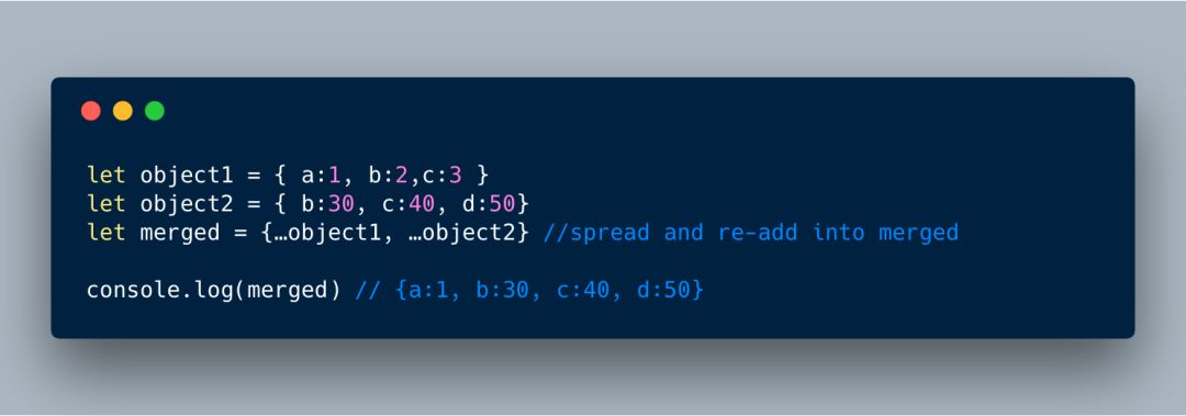 下面的例子中,我们新对象中使用扩展运算符来扩展对象。第 2 个对象中的键值对会覆盖第 1 个对象中的键值对 [译者注:如果键名相同的话]。