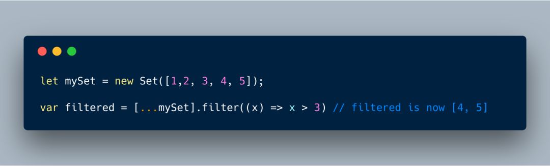 将Sets转换为数组只需要简单的使用的一个展开运算符(… )。同时你也能在Sets里使用所有数组相关的方法。