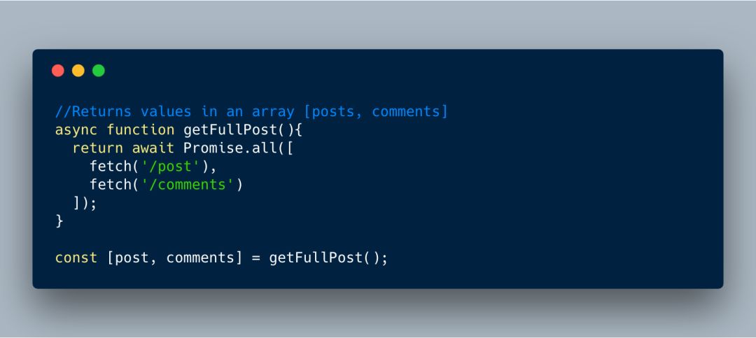 在下面的例子中,我们正在从/post上获取帖子,以及存在/comments中相关评论。由于我们使用async / await,函数返回结果保存在数组中。使用数组解构,我们可以直接将结果直接分配给相应的变量。