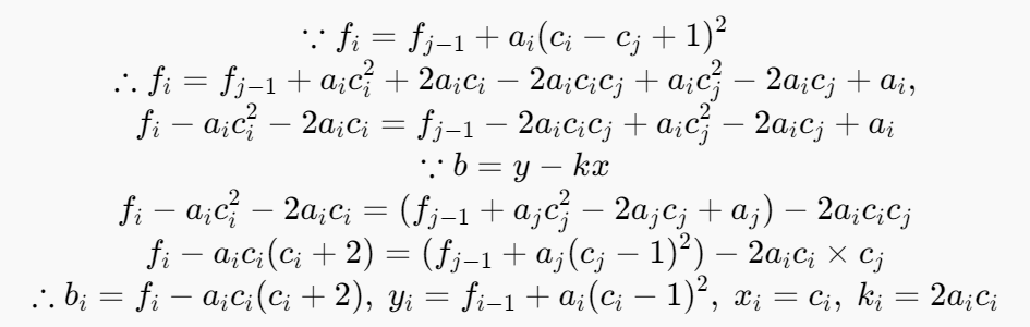 根据题意,显然有 \(f_i=f_{j- 1} + a_i(c_i-c_j+1)^2\),其中 \(c_i\) 表示 \(a_i\) 是该数值第几个出现的(在整个序列中),且满足 \(a_i=a_j\)(此时最优)。把这个柿子拆开,把 只和 \(i\) 有关的、只和 \(j\) 有关的、和 \(i,\ j\) 有关的 分隔出来,分别用 \(b,\ y,\ kx\) 表示。像这样:过程图示。