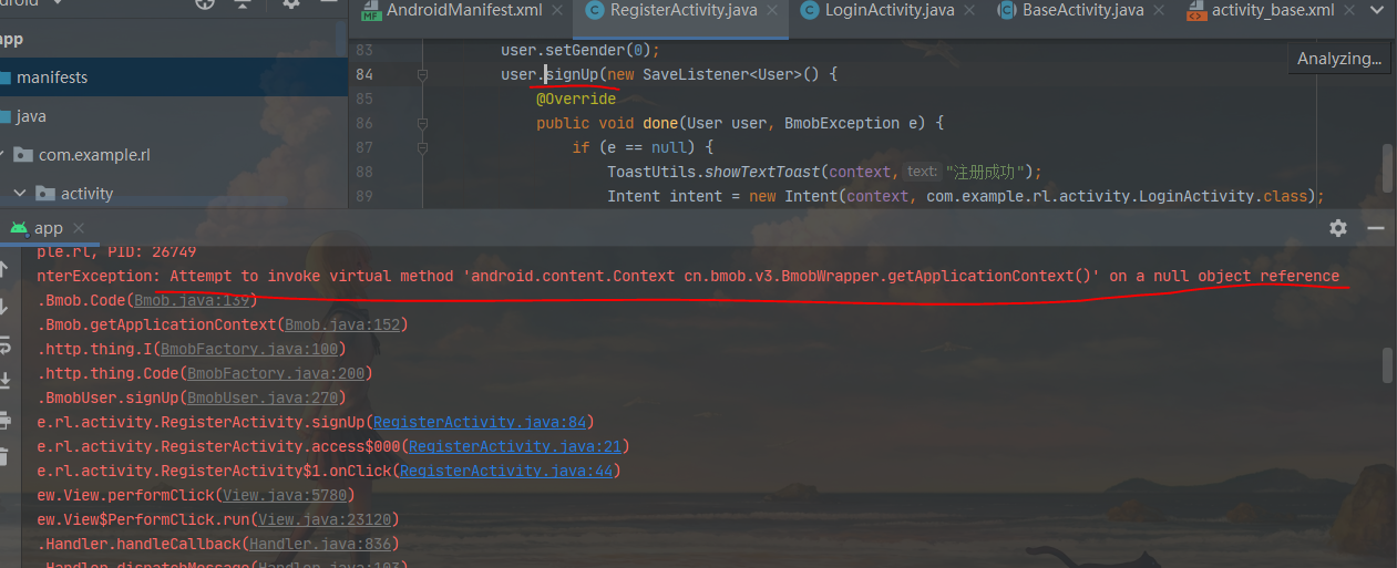 Attempt to invoke virtual method 'android.content.Context cn.bmob.v3.BmobWrapper.getApplicationContext()' on a null object reference