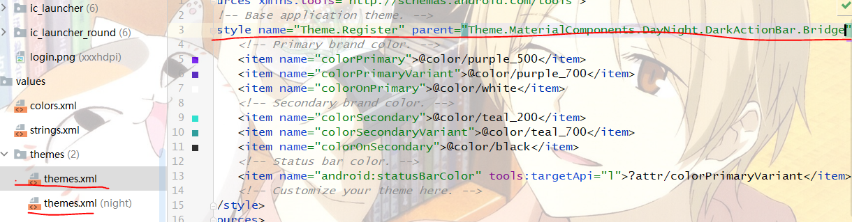 2,在界面设计中,发现按钮颜色默认紫色且无法更改,原来是因为themes里的文件:
