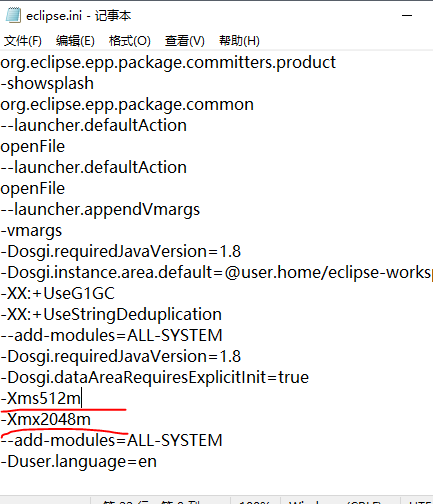 在eclipse目录下的eclipse.ini中最底下几行,修改下内存大小: