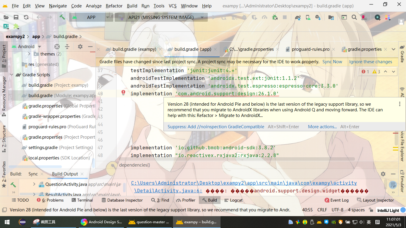 build.gradle里面,把原来的design那句删除,然后导入依赖