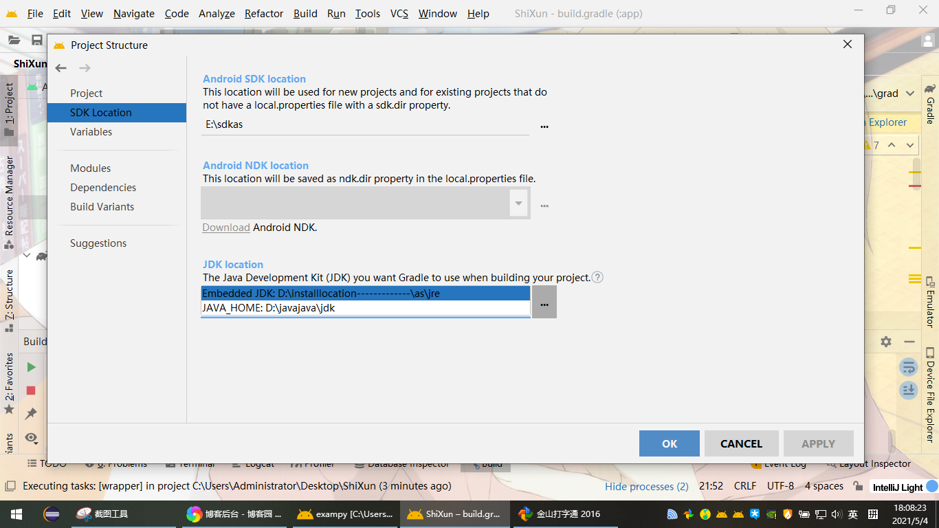 修改jdk的路径,我的as里有两个jdk环境变量,一个是我自己的1.8版本,一个是as自带的jdk11,