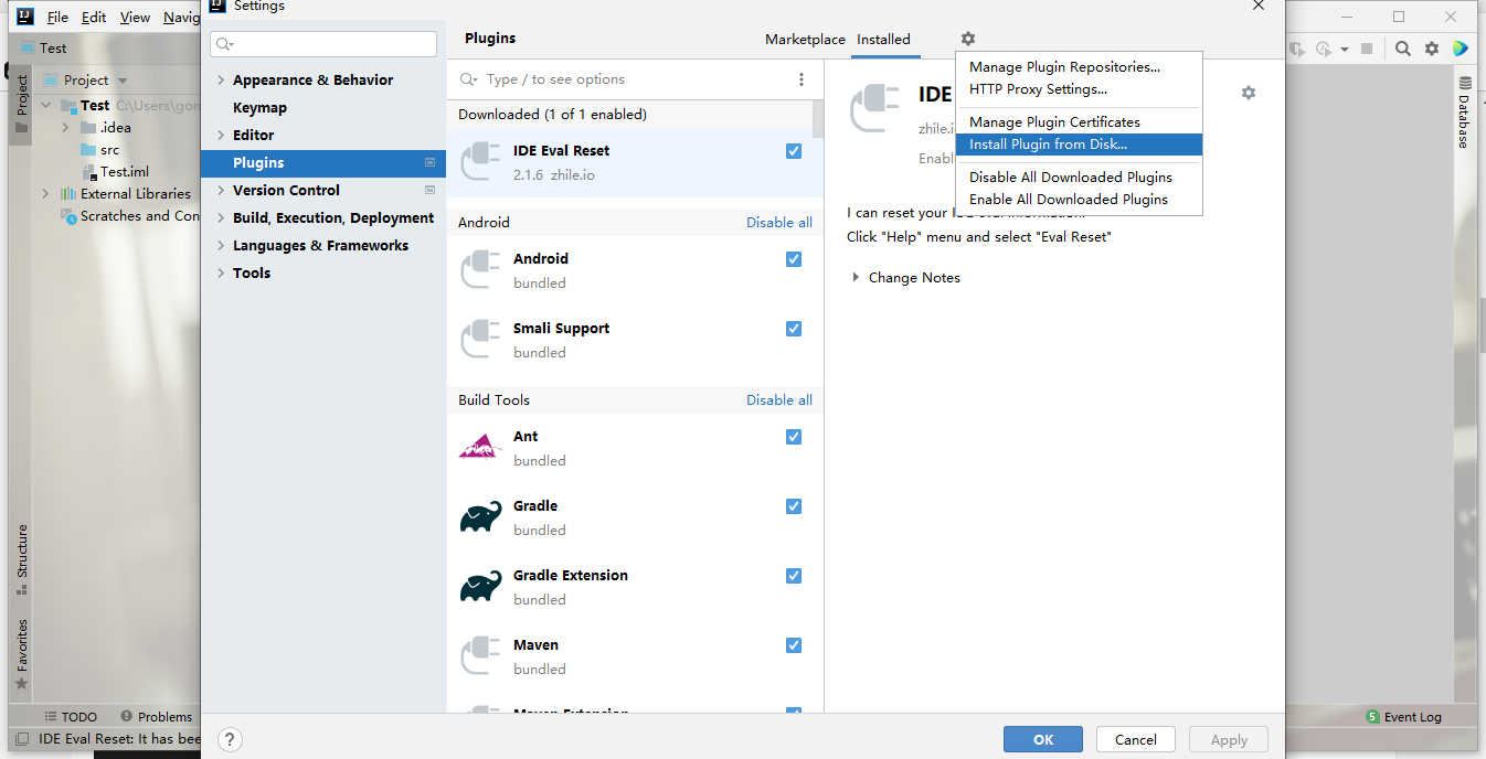 打开菜单file>Settings-> Plugins 里手动安装插件(Install Plugin From Disk...),
