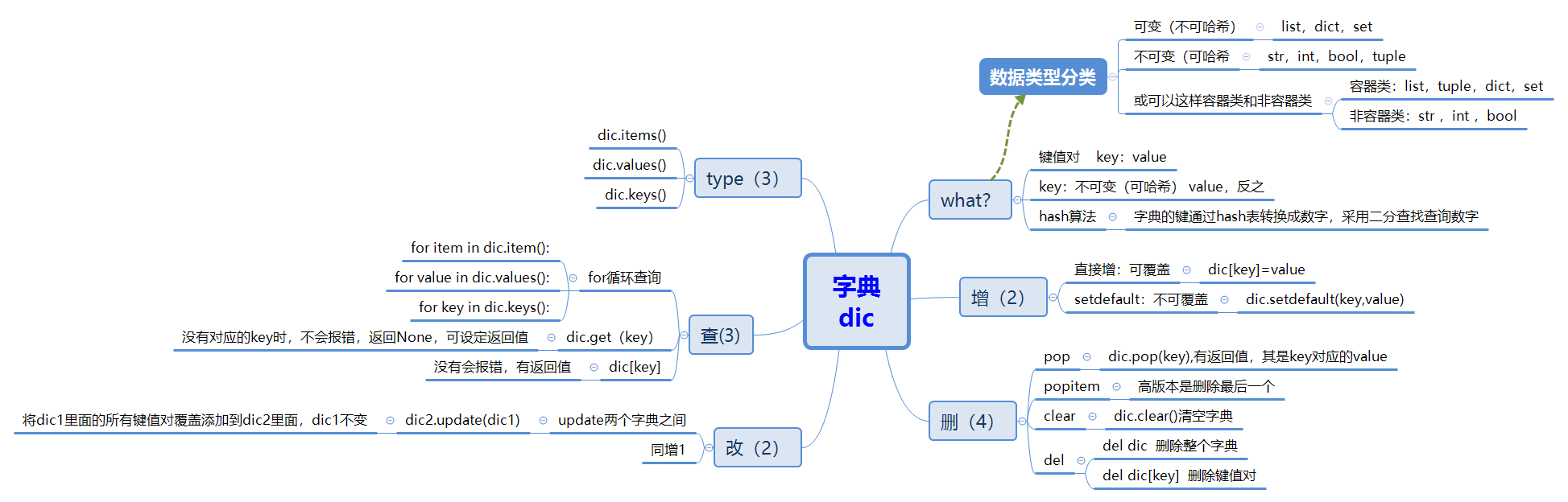 字典是python中唯一的映射类型,采用键值对(key-value)的形式存储数据。python对key进行哈希函数运算,根据计算的结果决定value的存储地址,所以字典是无序存储的,且key必须是可哈希的。可哈希表示key必须是不可变类型,如:数字、字符串、元组。