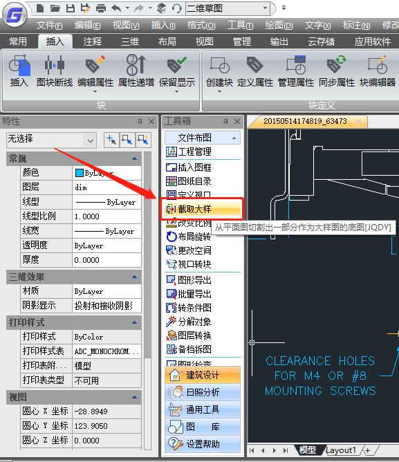 首先打开浩辰CAD建筑软件,然后在菜单栏中找到并依次点击建筑设计→文件布图→截取大样(JQDY)。如下图所示: