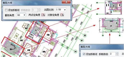 点取菜单命令后,显示对话框如下图所示,用户首先设置图形切割区域的出图比例,由于本实例在斜向布置的平面图上截取大样,需要单击两点定角度图标,在图中以两点定角度选择共线的两点定义截取角度;选择是否添加切断线,然后按命令行提示响应: