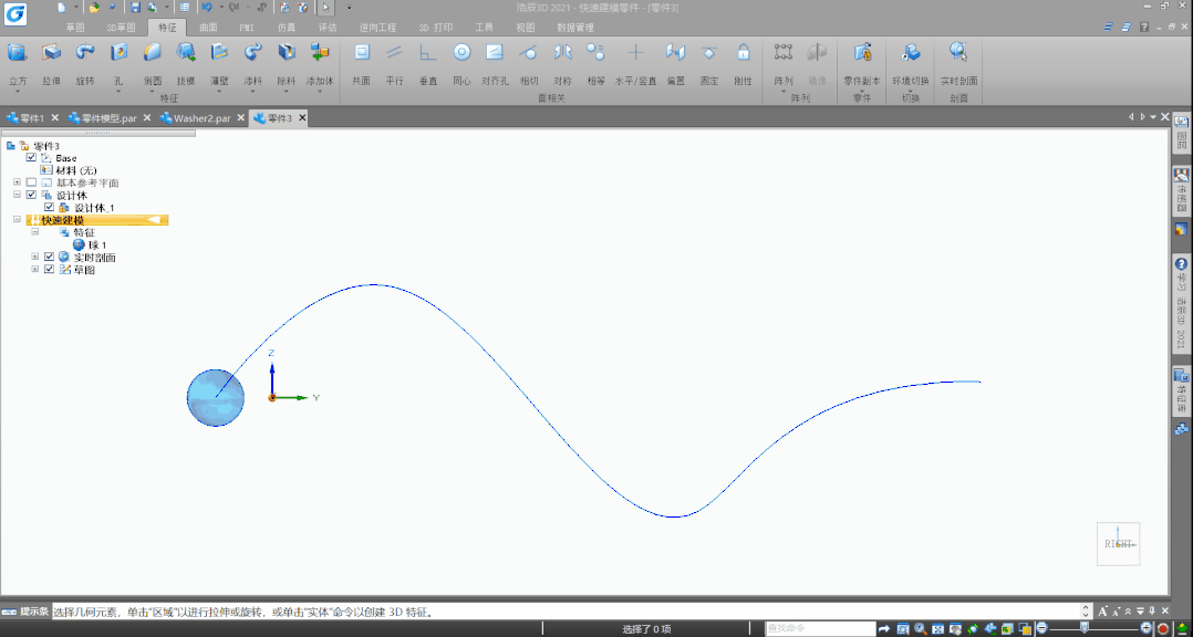 在使用浩辰3D建模软件的曲线阵列前,需要绘制一根曲线(直线也可以)。点击「阵列」命令,选择「沿曲线阵列」,样例选择对象是体(球)。选择所画曲线,勾选锚点及其方向,并输入沿曲线阵列的参数。