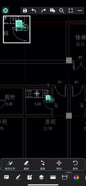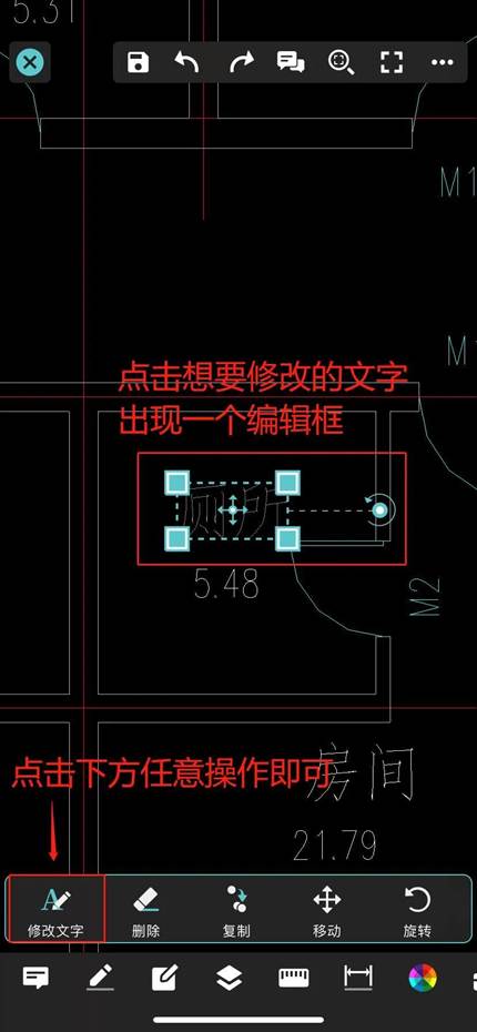 1、首先在手机中打开浩辰CAD看图王,然后打开需要修改的CAD图纸,接着将看图模式切换为“高级制图”(一定要切换),然后点击想要修改的文字,软件的工具栏会出现“修改文字”、“删除”、“复制”等按钮,选择相应的按钮操作即可。如下图所示: