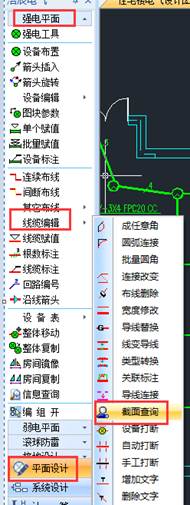 首先打开浩辰CAD电气软件,然后找到并依次点击【平面设计】→【强电平面】→【线缆编辑】→【截面查询】。如下图所示: