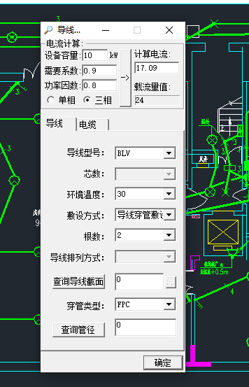 查询截面:得到计算电流后,在下面的表单中,选择导线型号,芯数,环境温度和敷设方式等,点击[查询导线截面],软件自动查询得到导线截面。