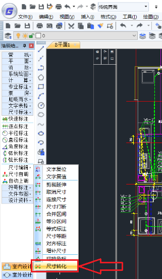 首先打开浩辰CAD给排水软件,然后找到菜单位置:[室内设计]→ [尺寸标注] → [尺寸编辑] → [尺寸转化]。如下图所示: