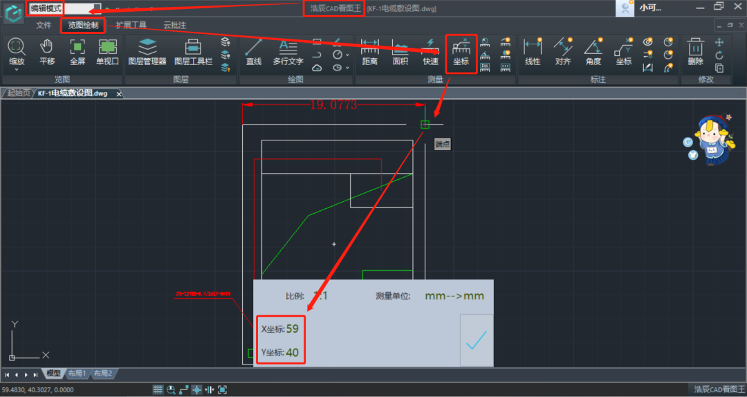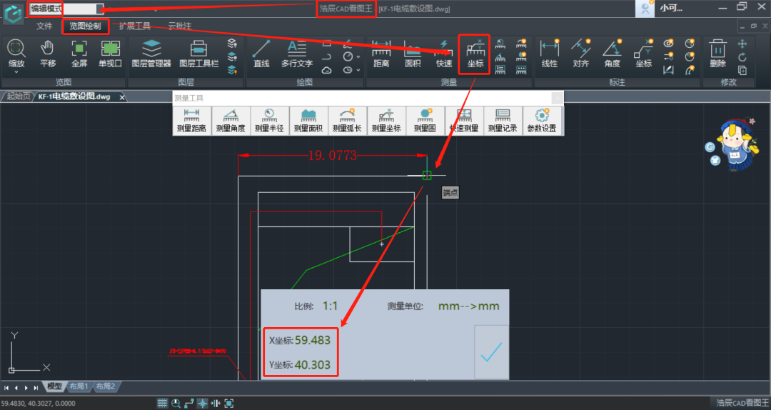 坐标测量的位置:【浩辰CAD看图王】电脑版【览图绘制】菜单栏【测量】工具箱中。
