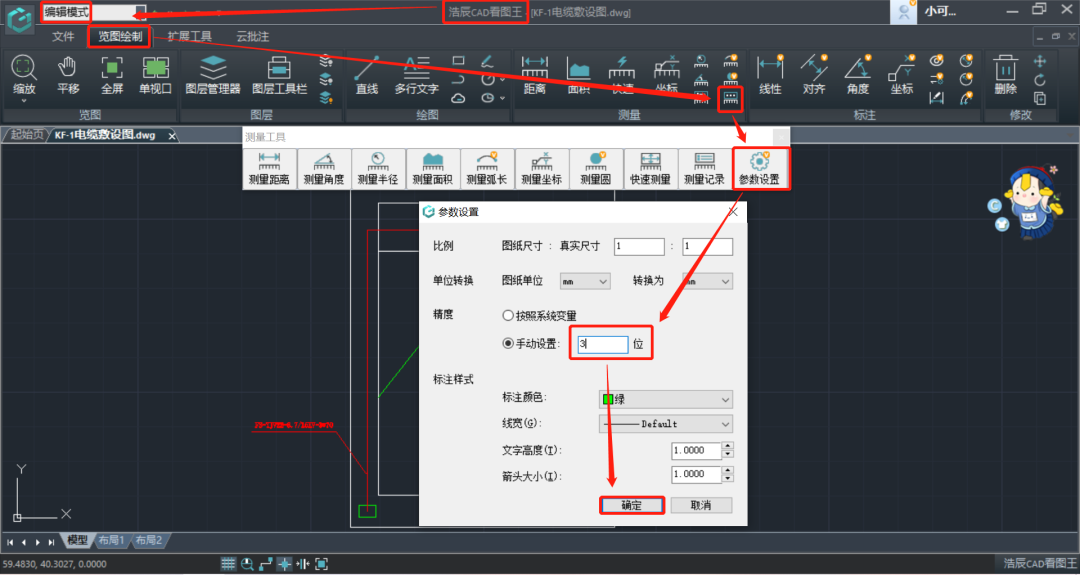 CAD测量精度设置:在【测量工具】菜单中点击【参数设置】按钮,可以手动设置测量结果的精度,如下图所示,我们将测量结果的精度改成小数点后保留3位。