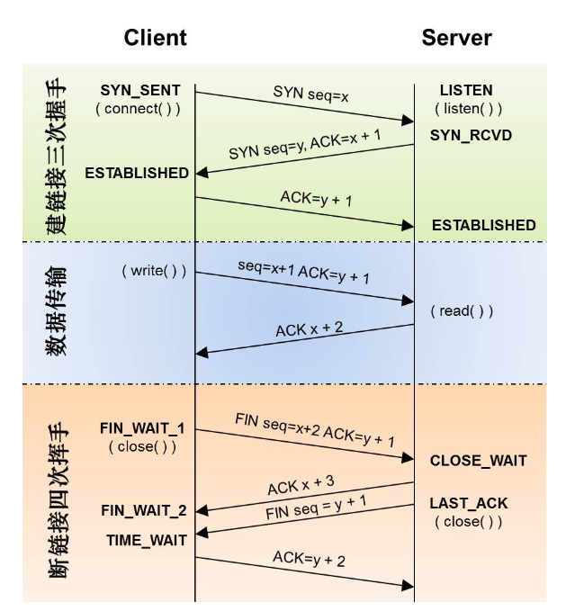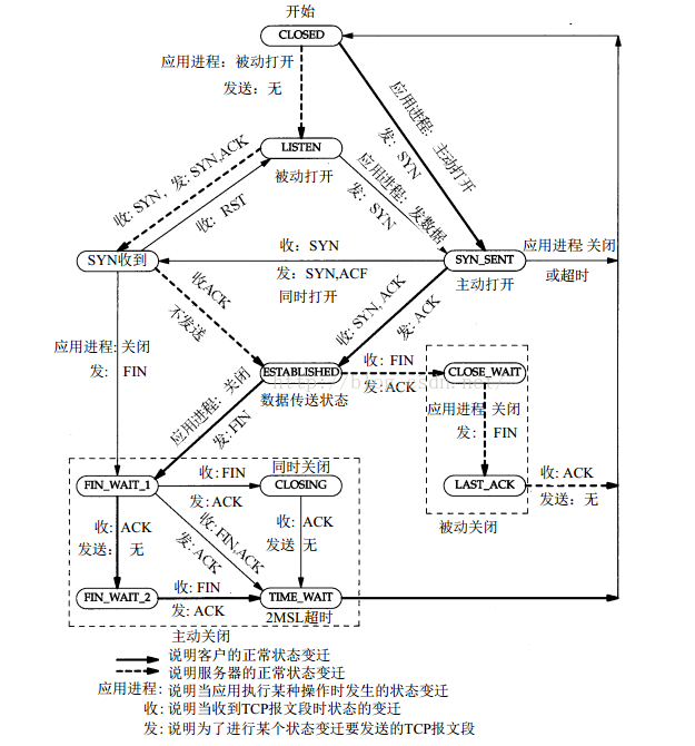客户端的状态变迁:CLOSED-->SYN_SENT-->ESTABLISHED-->FIN_WAIT_1-->FIN_WAIT_2-->TIME_WAIT-->CLOSED