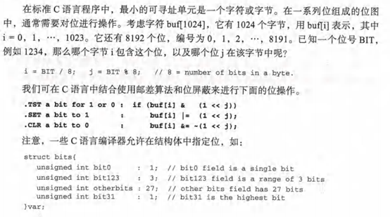 该结构体将var.定义为一个32位无符号整数,具有单独的位或位范围。那么,var.bi0=0;将1赋值给第0位,则有var.bit123=5;将101赋值给第1位到第3位等。但是,生成的代码仍然依赖于邮差算法和位屏蔽来访问各个位。我们可以用邮差算法直接操作位图中的位,无须定义复杂的C语言结构体。