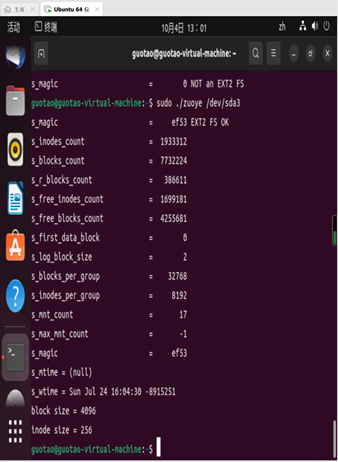 (1)读取超级块。检查幻数s magic(0xEF53),验证它确实是 EXT2 FS。