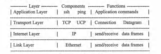 • 顶层是使用TCP/IP的应用程序。用于登录到远程主机的ssh,用于交换电子邮件的mail、用于Web页面的http等应用程序需要可靠的数据传输。通常,这类应用程序在传输层使用TCP。另一方面,有些应用程序,例如用于查询其他主机的ping命令,则不需要可靠性。这类应用程序可以在传输层使用UDP来提高效率。