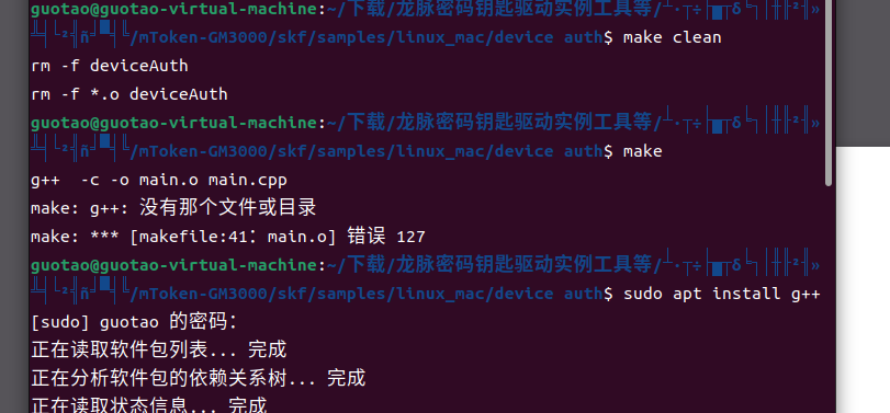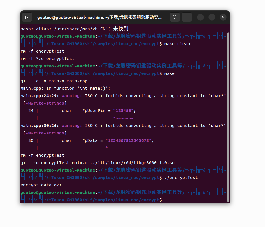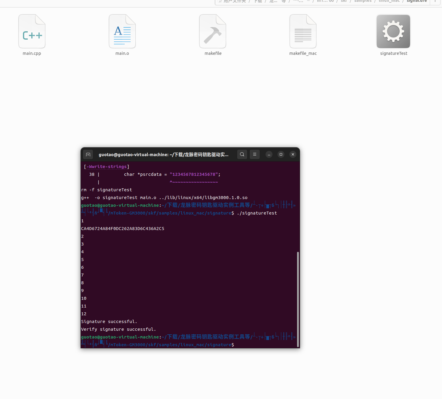 2 在Ubuntu中运行 “龙脉密码钥匙驱动实例工具等\mToken-GM3000\skf\samples\linux_mac”中例程,提交运行结果截图