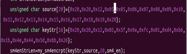 sm4enStrLen=my_sm4encrpt(keyStr,source,7,sm4_en);