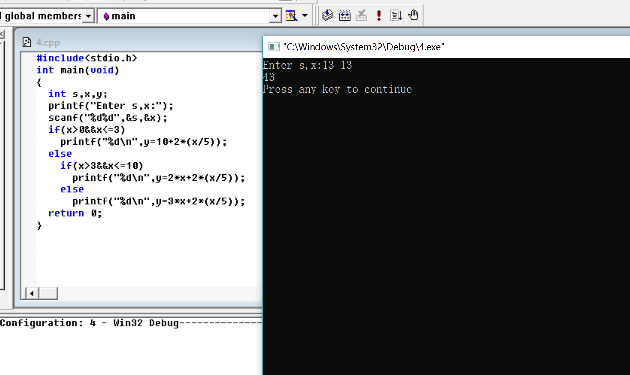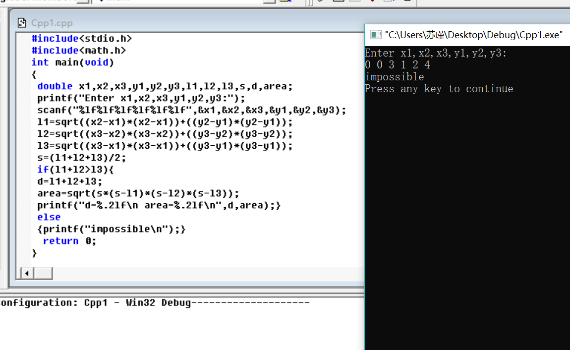 心得:调试过程中总是遇到一些问题,程序中没有错误,但输入数字后输出的结果总是不对,原来是在写边长的那里多了个括号。这两道题主要应用条件语句的一些知识,通过这两道题发现自身还存在一些问题,下去会再重点了解一下。