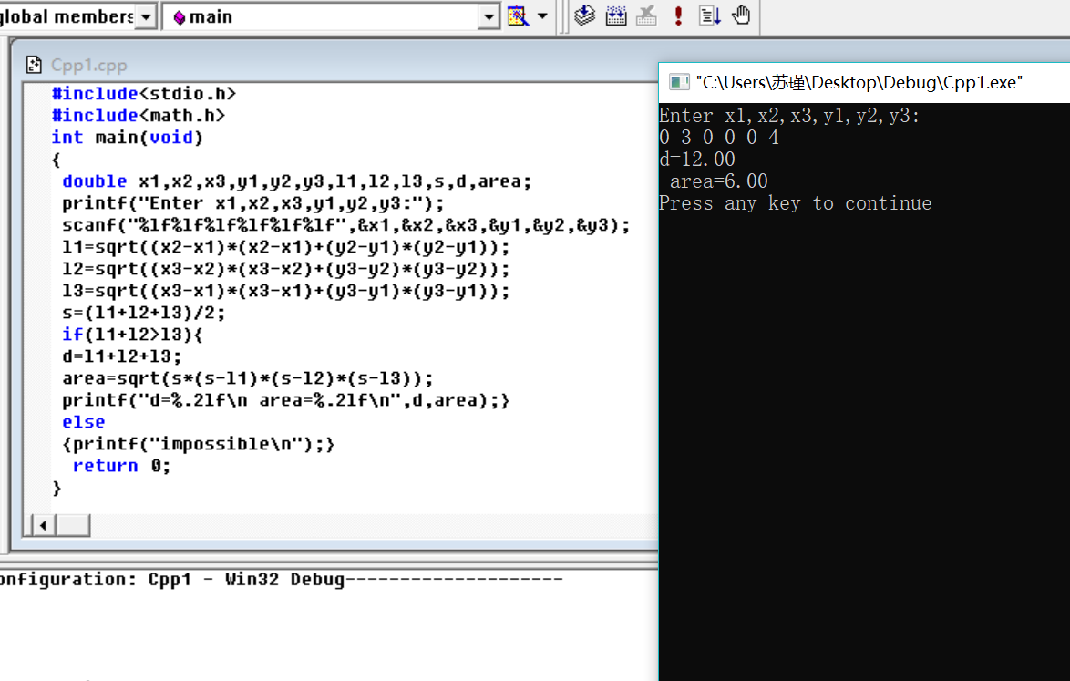 double x1,x2,x3,y1,y2,y3,l1,l2,l3,s,d,area;