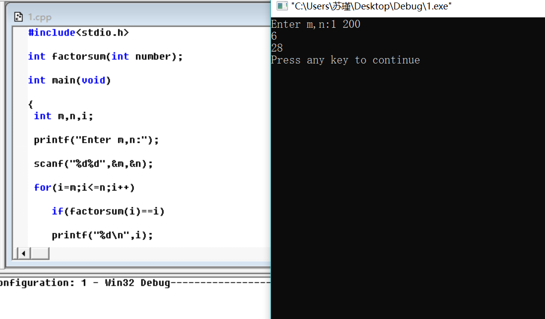 3.使用函数输出指定范围内的完数:输入两个正整数m和n (1≤m,n≤1000),输出m-n之间的所有完数,完数就是因子和与它本身相等的数。要求定义并调用函数factorsum(number),它的功能是返回number的因子和。例如,factorsum(12)的返回值是16(1+2+3+4+6)。试编写相应程序。
