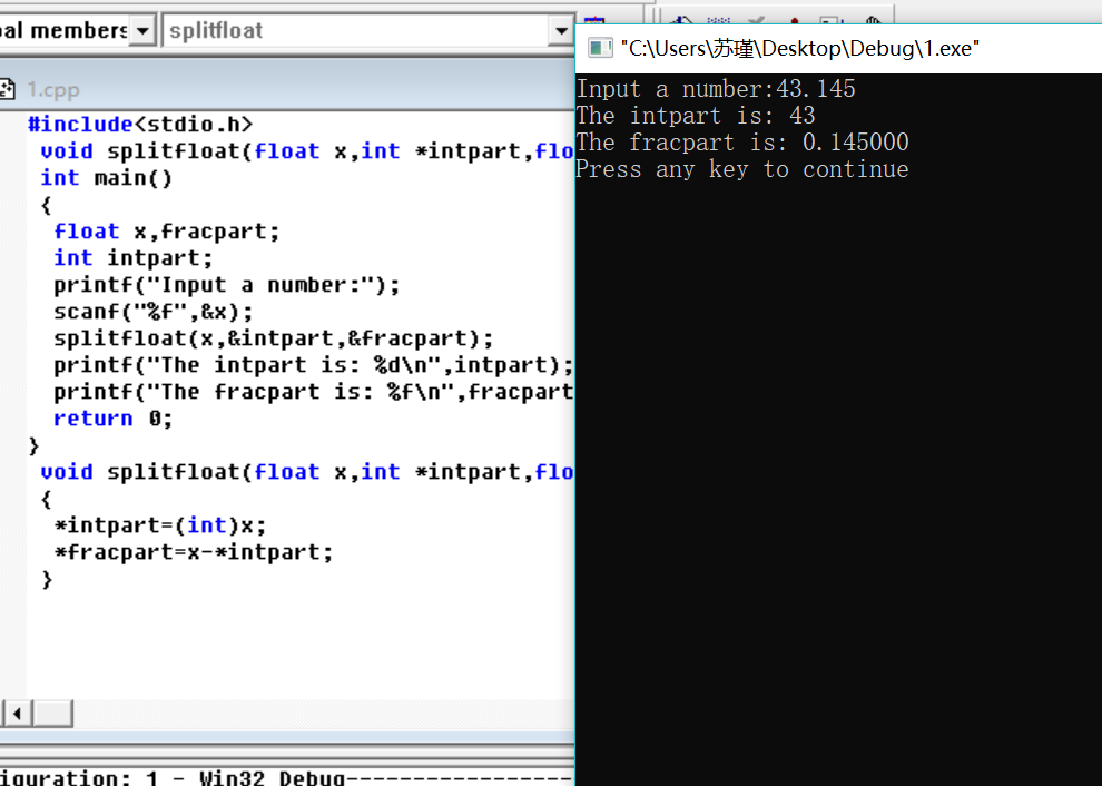 1、拆分实数的整数和小数部分:要求自定义一个函数void splitfloat(float x,int*intpart,float*fracpart),