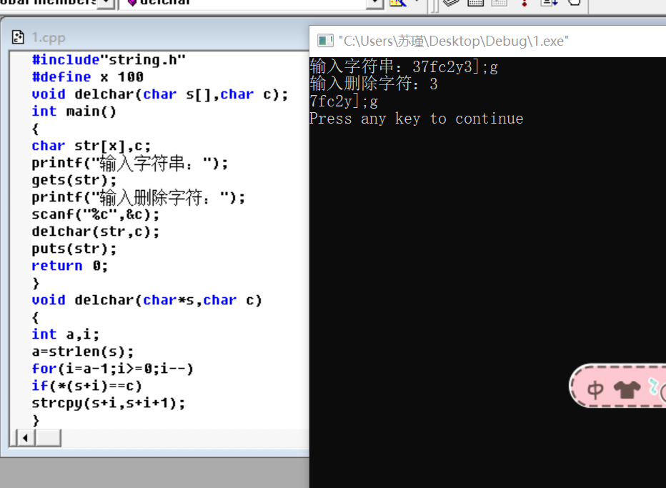 要求定义和调用函数delchar(s,c),该函数将字符串s中出现的所有c字符删除。试编写相应的程序。