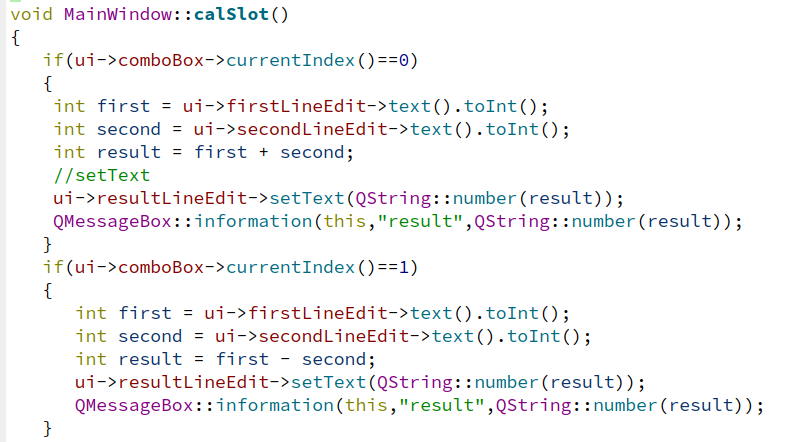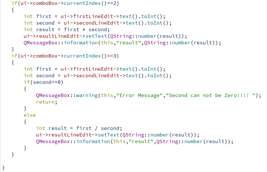 实现槽函数:其中使用类QMessageBox的information成员函数对最后结果的显示和除数为0时的报错窗口显示;