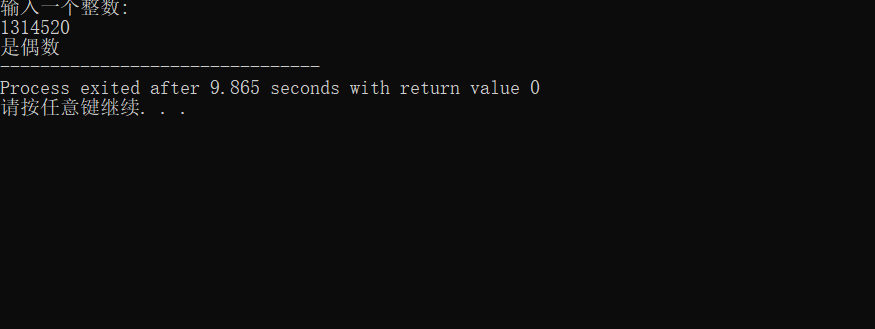 #include <stdio.h> int main() { int x; printf("输入一个整数: \n"); scanf("%d",&x); if(x%2==1) printf("是奇数"); else printf("是偶数"); return 0; }