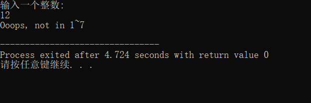 #include <stdio.h> int main() { int days; printf("输入一个整数: \n"); scanf("%d",&days); if (days==1||days==2||days==3||days==4||days==5) printf("workdays, fighting\n"); else if(days==6||days==7) printf("weekend, relax~\n"); else printf("Ooops, not in 1~7\n"); return 0; }