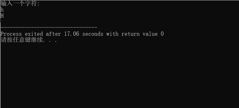 #include <stdio.h> int main() { char ch; printf("输入一个字符:\n"); scanf("%c",&ch); if('a'<=ch&&ch<='z') ch=ch-32; else if('A'<=ch&&ch<='Z') ch=ch; printf("%c\n",ch); return 0; }