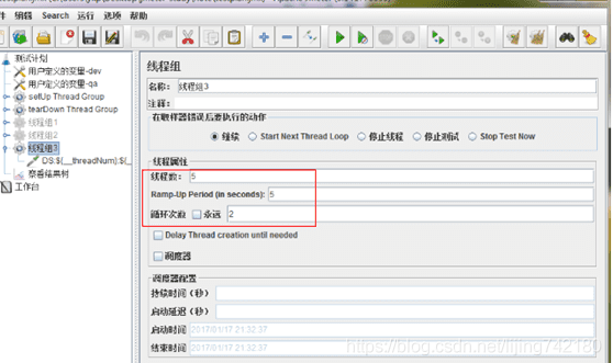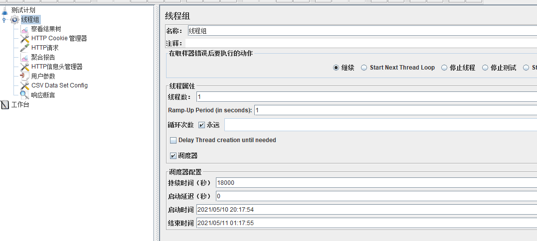 如图:5个线程,5秒启动时间,每个线程执行两次循环,一共请求10次,每个线程之间启动延迟为 1 秒