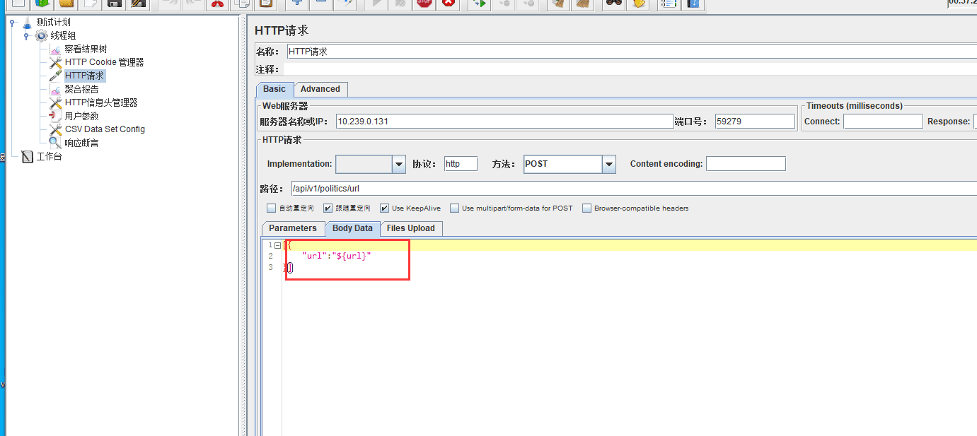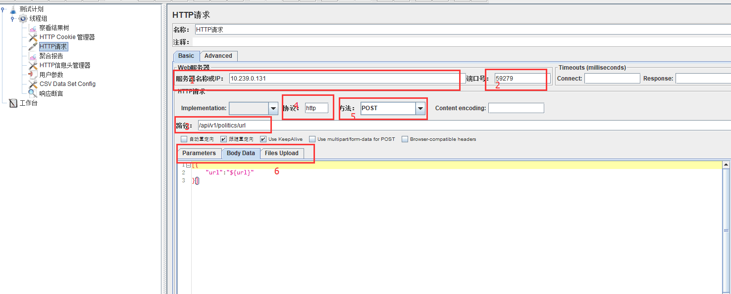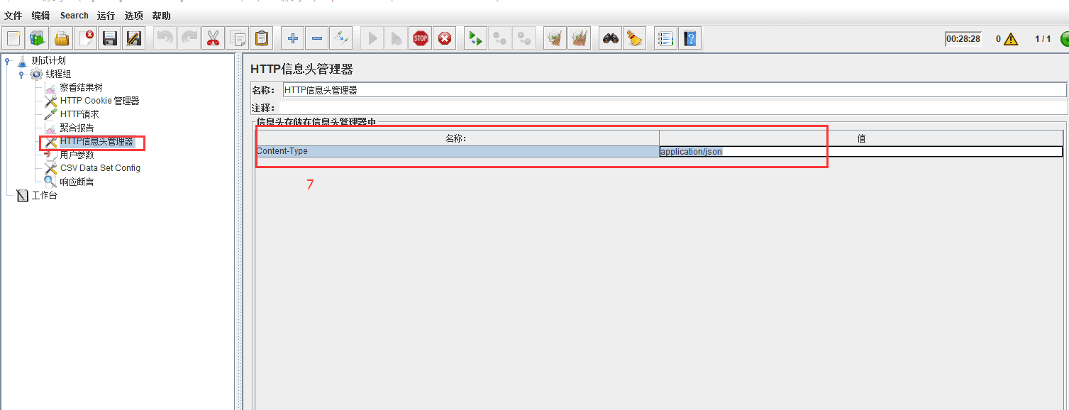 添加:HTTP请求(线程组->Sampler->HTTP请求) HTTP信息头管理器(线程组->配置元件-> HTTP信息头管理器) 1:输入对应的ip 2、端口号 3、路径 4、协议:http 5、post请求 6、请求体:form格式选择Parameters、json格式选择bodydata,文件格式选择files 7、Content-Type:application/json