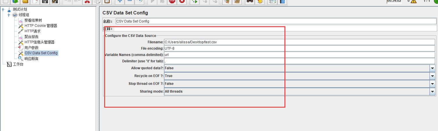 CSV Data Set Config(线程数->配置元件->CSV Data Set Config) 支持txt\csv等文件格式(将变量直接用文件形式存放) Filename:存放变量文件路径名称(用反斜杠/) File encoding:文件格式UTF-8 Variable Names:变量名称(与请求的变量名称一致) 其他部分不变 HTTP请求:请求体设置变量用${变量名称}