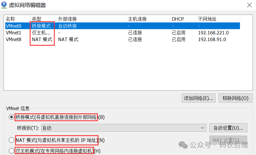 打开VMware,点击编辑 ->虚拟网络编辑器,可以查看对应的三种网络模式。