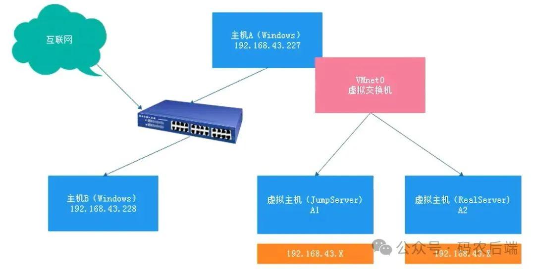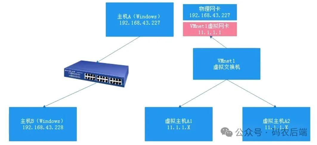 如下图,两台主机通过交换机组装成一个局域网(如要连接外部网络,则需要路由器)。桥接模式使用了一张 VMnet0的虚拟网卡,和主机A共用一张网卡,并基于这张网卡来连接外部环境。若采用桥接模式,则虚拟主机A1和A2都连接在同一个虚拟交换机上。由于是共用一张网卡,所以虚拟主机A1和A2的IP地址为192.168.43.X的形式(处于同一个网段),左侧是物理真机部分,右侧是虚拟机部分,这样就使整个组成了一个局域网。很显然,虚拟主机A1、A2之间可以互相访问;主机A与A1、A2也能互相访问;同理,主机B与A1、A2也能互相访问(ping IP地址,能ping通)。