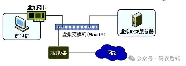 相当于一个独立的网络环境,与物理真机不处于同一个网段。但是可以通过虚拟网络路由器(NAT地址转化)连接外网。