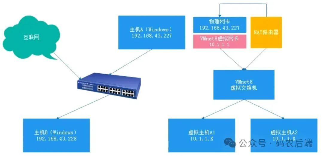 如下图,与仅主机模式一样,主机A与A1、A2可以互相访问;但主机B无法访问A1、A2(处在不同的网段)。之所以VMnet8也能连接外网,是因为在仅主机模式的基础上增加了一个NAT地址转换功能,通过NAT路由器借助于物理网卡,来实现上网,这也是其与仅主机模式的一个区别。