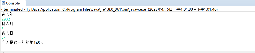 import java.util.Scanner; public class Ty { public static void main(String[] args) { //2.输入年月日,判断这是这一年中的第几天(知识点:循环语句、条件语句) Scanner sc = new Scanner(System.in); int sum = 0; System.out.println("输入年"); int year = sc.nextInt(); System.out.println("输入月"); int mon = sc.nextInt(); System.out.println("输入日"); int day = sc.nextInt(); int[] yue = new int[]{31, 29, 31, 30, 31, 30, 31, 31, 30, 31, 30, 31}; if (year % 4 == 0 && year % 100 != 0 || year % 400 == 0) { for (int i = 0; i < mon - 1; i++) { sum += yue[i]; } } else { for (int i = 0; i < mon - 1; i++) { sum += yue[i]; } sum -= 1; } sum += day; System.out.println("今天是这一年的第" + sum + "天"); } }